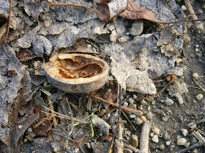 Ten ślad żerowania znalazłem przechodząc koło starej lipy. Pod nią to znalazłem kilkanaście wydziobanych połówek orzechów włoskich. Nie raz widziałem krukowatego siedzącego na gałęzi i obrabiającego orzecha włoskiego. Na zdjęciu widać ślad dzioba w lewym górnym rogu skorupki. Myślę, że tutaj dziób zadziałał jako klin aby rozdwoić orzech na połówki. Po prostu krukowaty nadział na dziób orzecha i stukał nim o gałąź. Nie raz widziałem i słyszałem taką scenę na spacerze.